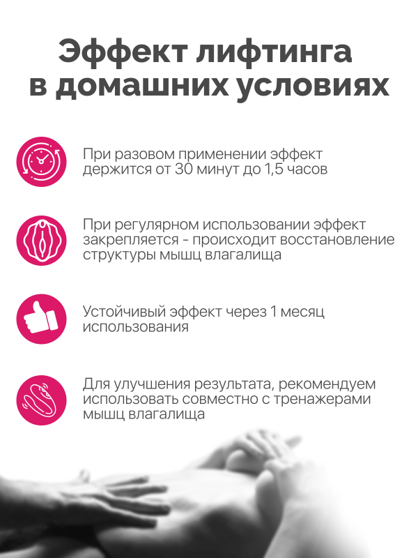 При регулярном использовании эффект закрепляется - происходит восстановление структуры мышц влагалища, процедура сравнима с косметологическим лифтингом. Гель восстанавливает структуру тканей влагалища. Особо эффективен для устранения послеродовых изменений. Обеспечивает устойчивый эффект при регулярном использовании уже через месяц. Для найлучших результатов рекомендуется использовать с вагинальными шариками и тренажерами Кегеля